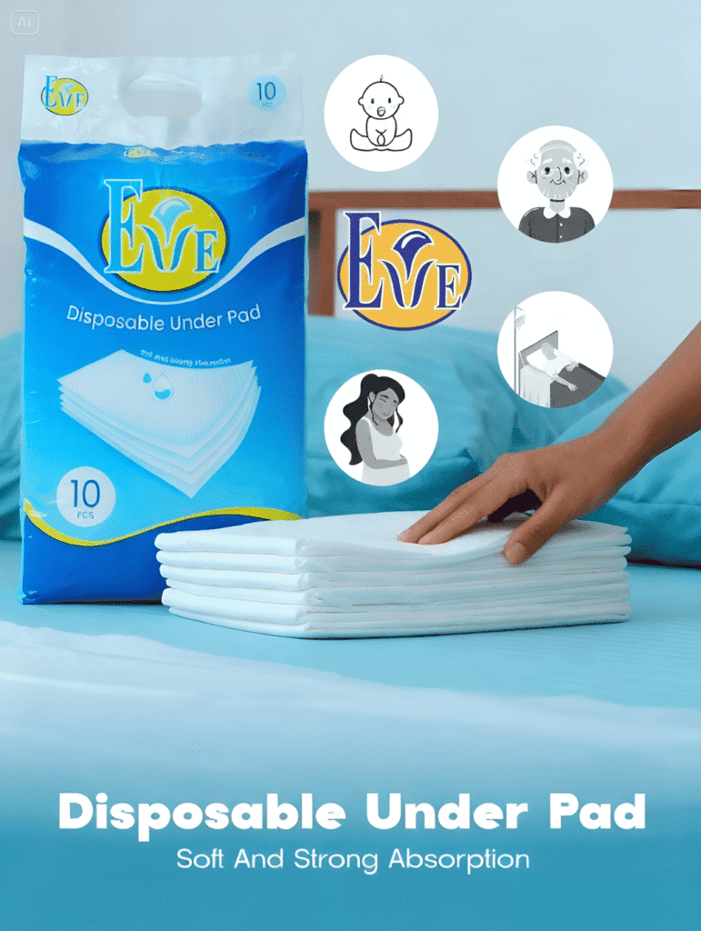 Whether used for baby care, adult care, or medical support, EVE Disposable Underpad helps maintain cleanliness, dignity, and hygiene in everyday life.